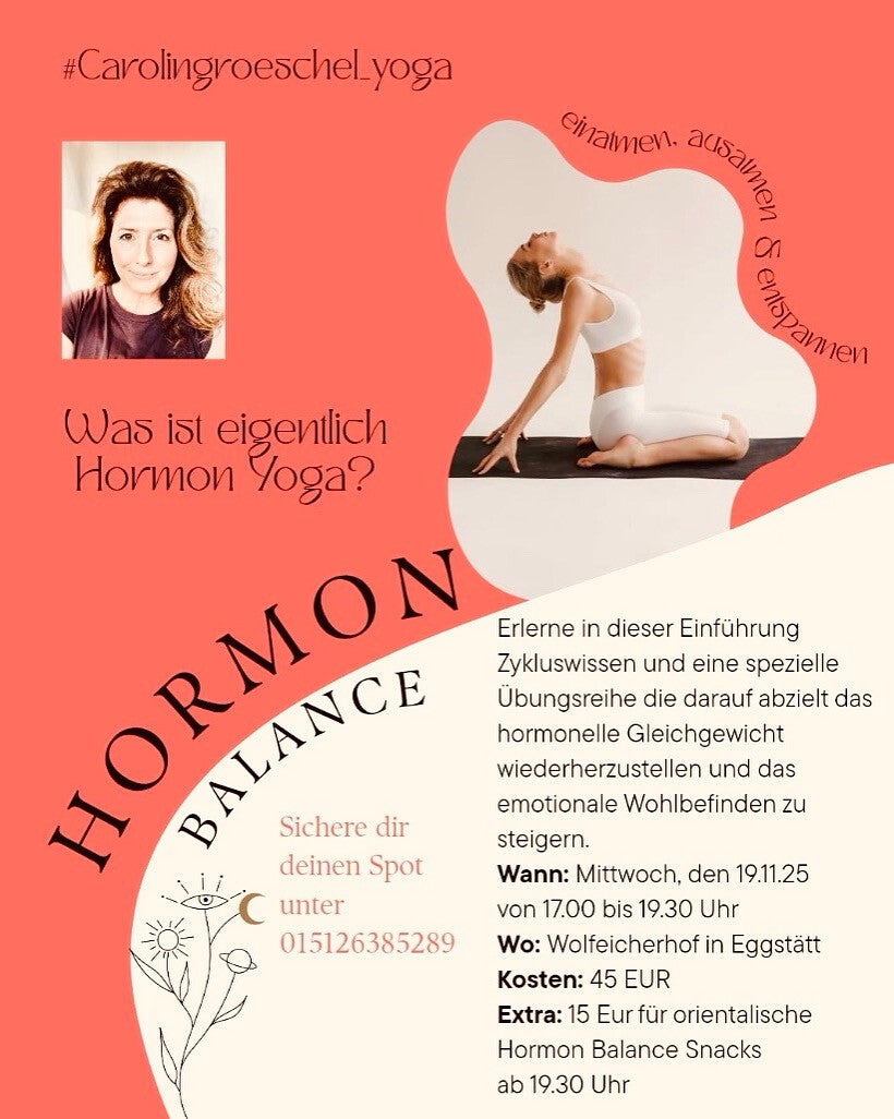 In diesem Workshop hast du die Gelegenheit, die positive Wirkung von Yoga auf den weiblichen Organismus für dich zu entdecken. Es werden Elemente aus dem Hatha Yoga (Asanas), Pranayama (Atemtechnik), der Konzentration und Meditation angewandt und du lernst Übungen, die harmonisierend auf das weibliche Hormonsystem wirken. So kannst du deinen Körper in den verschiedenen Phasen des Lebens unterstützen, zum Beispiel bei Menstruationsbeschwerden, Kinderwunsch, Begleiterscheinungen der Menopause oder anderen hormonellen Dysbalancen. Gleichzeitig wirken die Übungen positiv auf Haut und Haare und stärken das Immunsystem. Du erhältst eine Anleitung mit Übungen, damit du deine eigene Yogapraxis in den Alltag etablieren kannst.